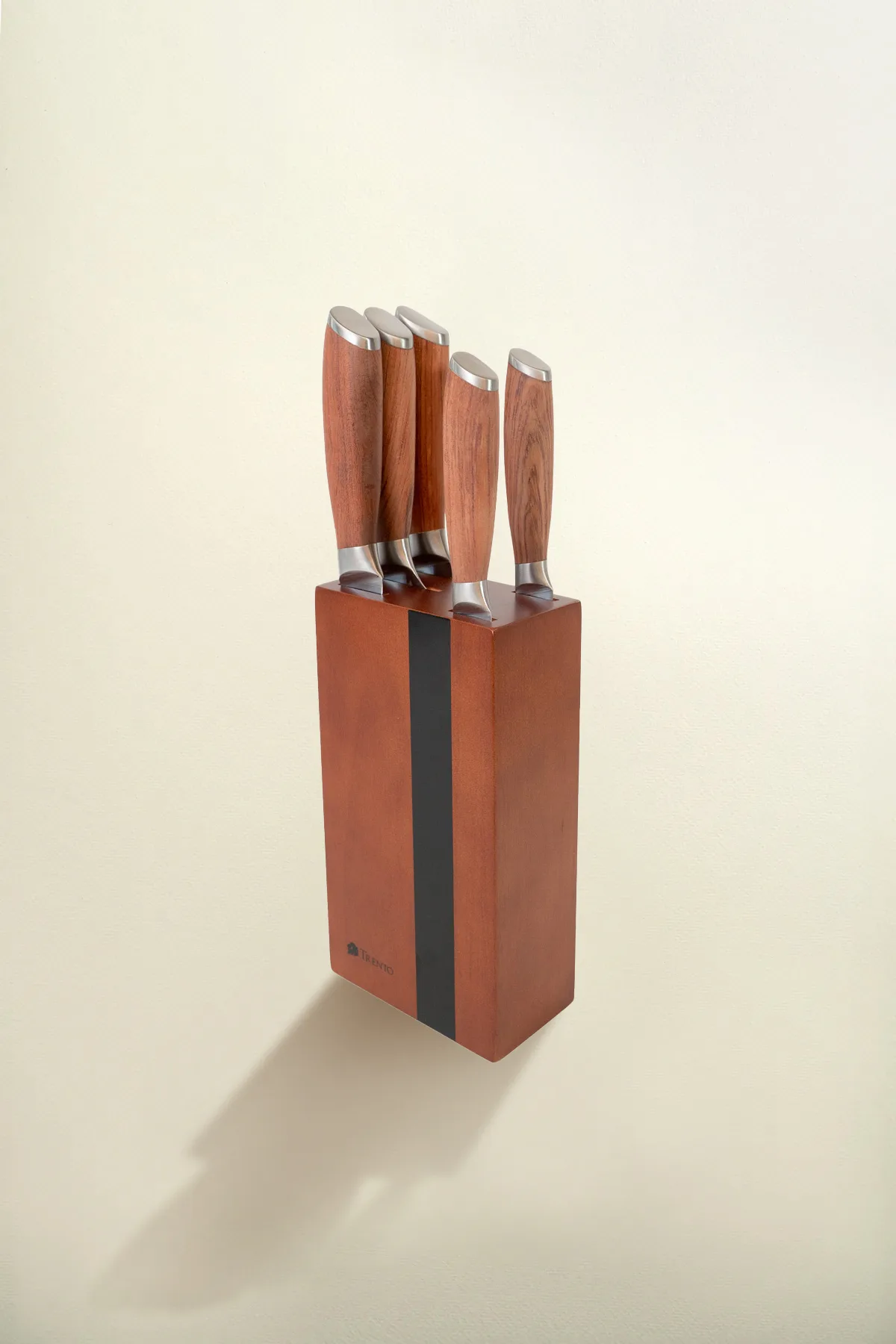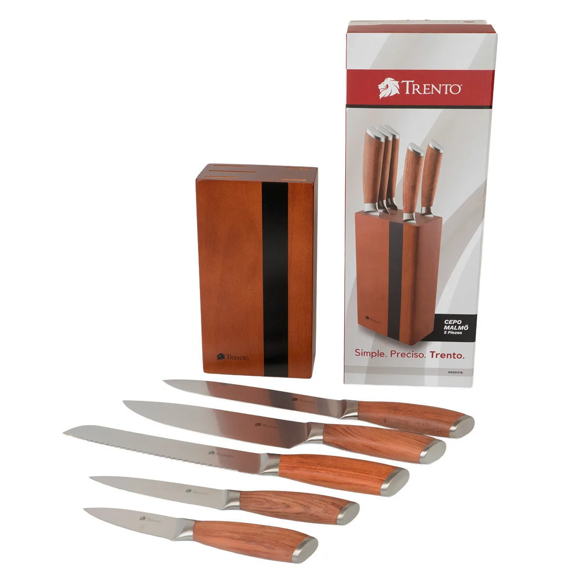 El cepo Trento Malmo de 5 piezas ofrece una solución integral y estética para el equipamiento de la cocina moderna. Este set incluye una selección de cuchillos fundamentales fabricados con hojas de acero inoxidable 420, un material que garantiza una excelente retención del filo liso y una resistencia superior ante el uso cotidiano. La precisión en el corte se complementa con un diseño sofisticado que realza cualquier mesada gracias a su base de almacenamiento vertical.