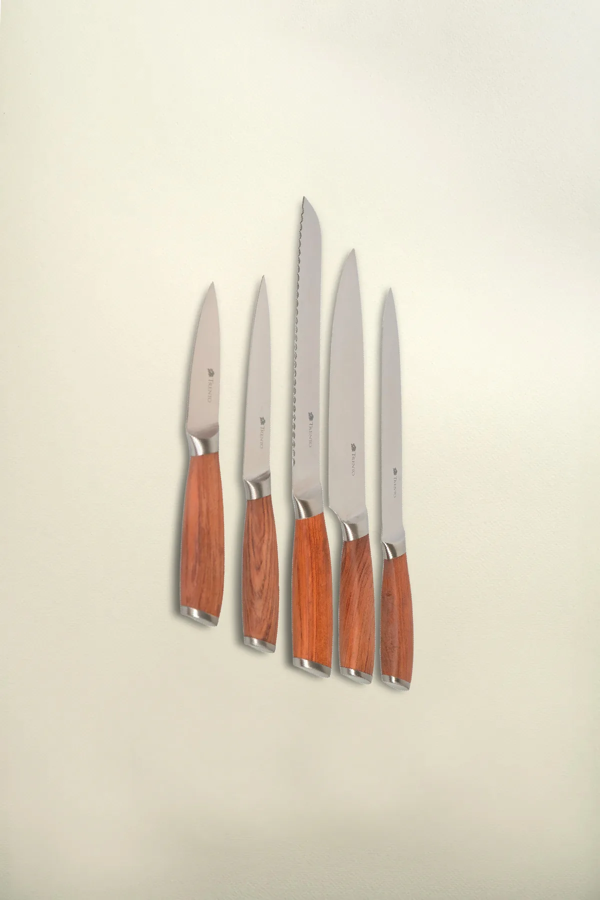 El set Trento Malmo incluye 5 piezas de alta calidad con hojas de acero inoxidable 420. Destaca por su filo liso y mangos elegantes de madera palo rosa.